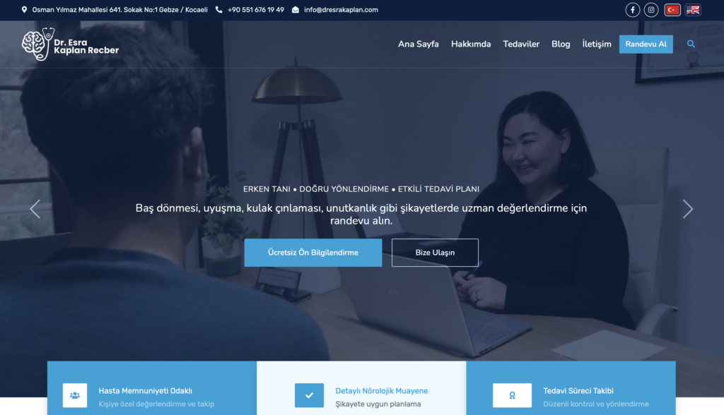 Dr. Esra Kaplan Reçber’in Google Business görünürlüğünü güçlendiren, web sitesini performanslı ve SEO uyumlu hale getiren, sürdürülebilir bir dijital büyüme altyapısı sundu.
